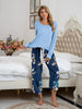 Made from 100% soft polyester, this two-piece set combines a relaxed round-neck top with vibrant printed pants, creating the perfect look for lounging, sleeping, or casual days at home.